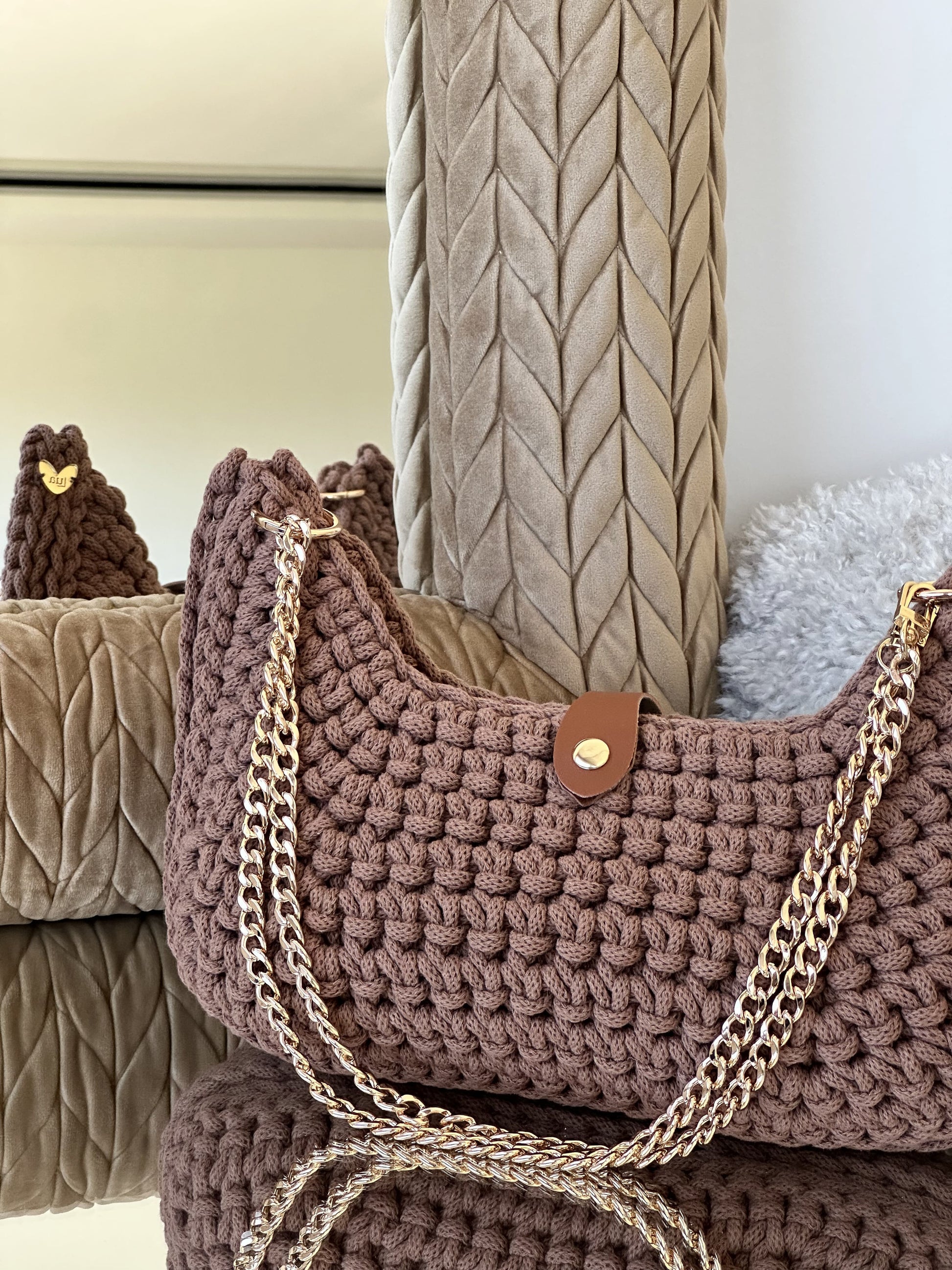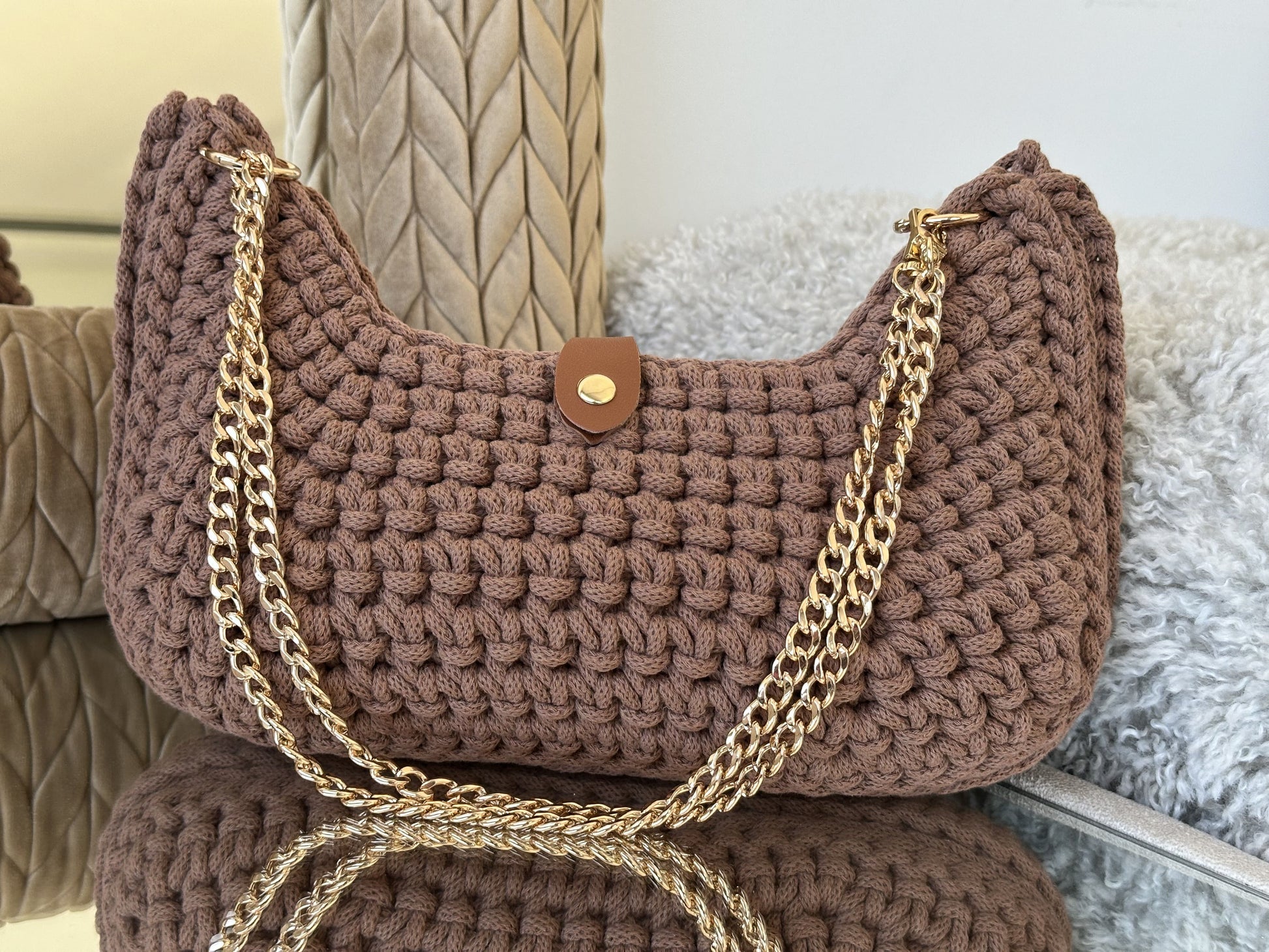 Tejido a mano con hilo de 5 mm, este bolso mantiene la curva sutil de la media luna, pero al sustituir el aro por una cadena metálica su silueta adquiere un aspecto más cuadrado y estructurado, perfecto para quienes buscan un estilo contemporáneo y versátil.