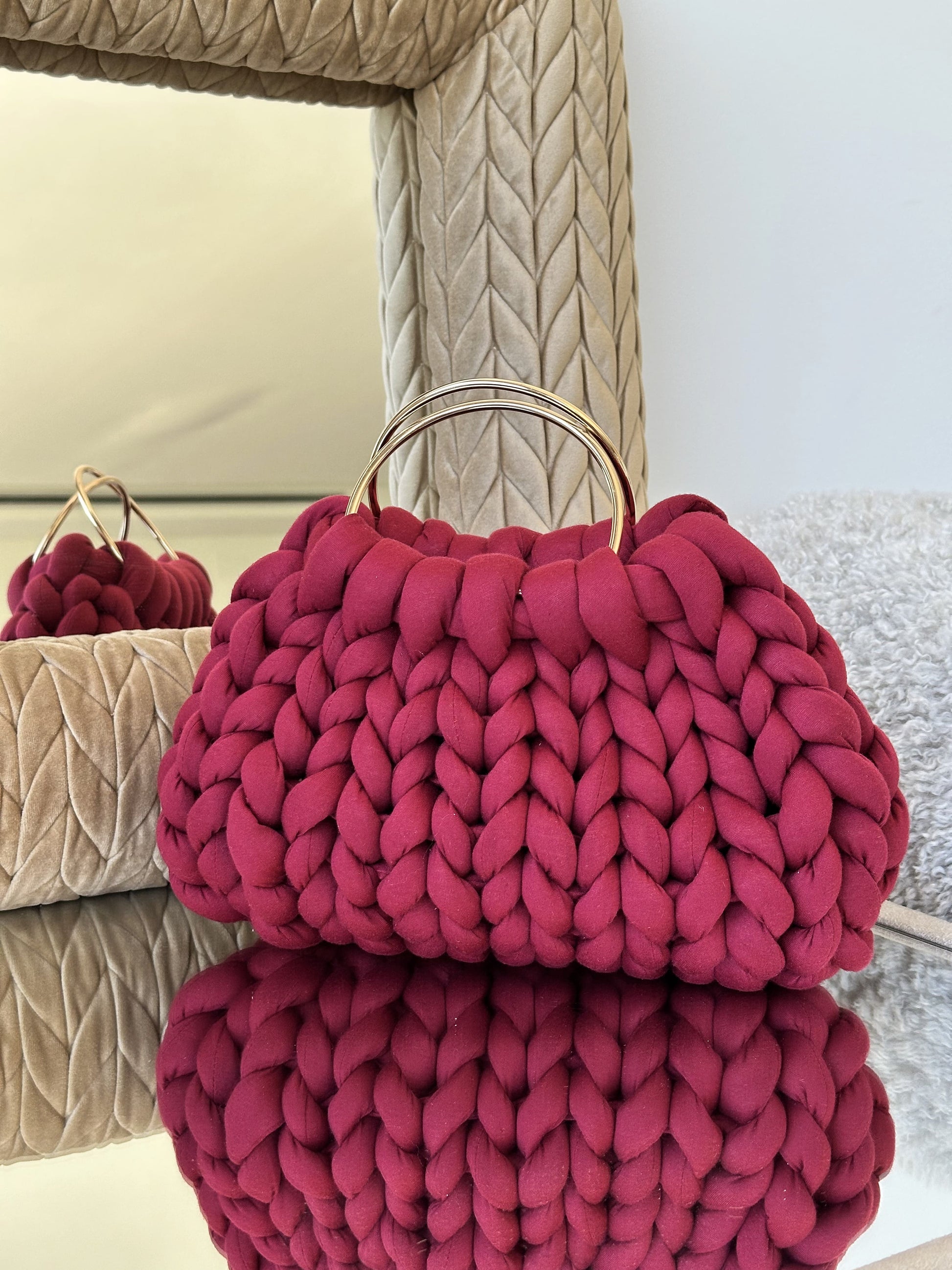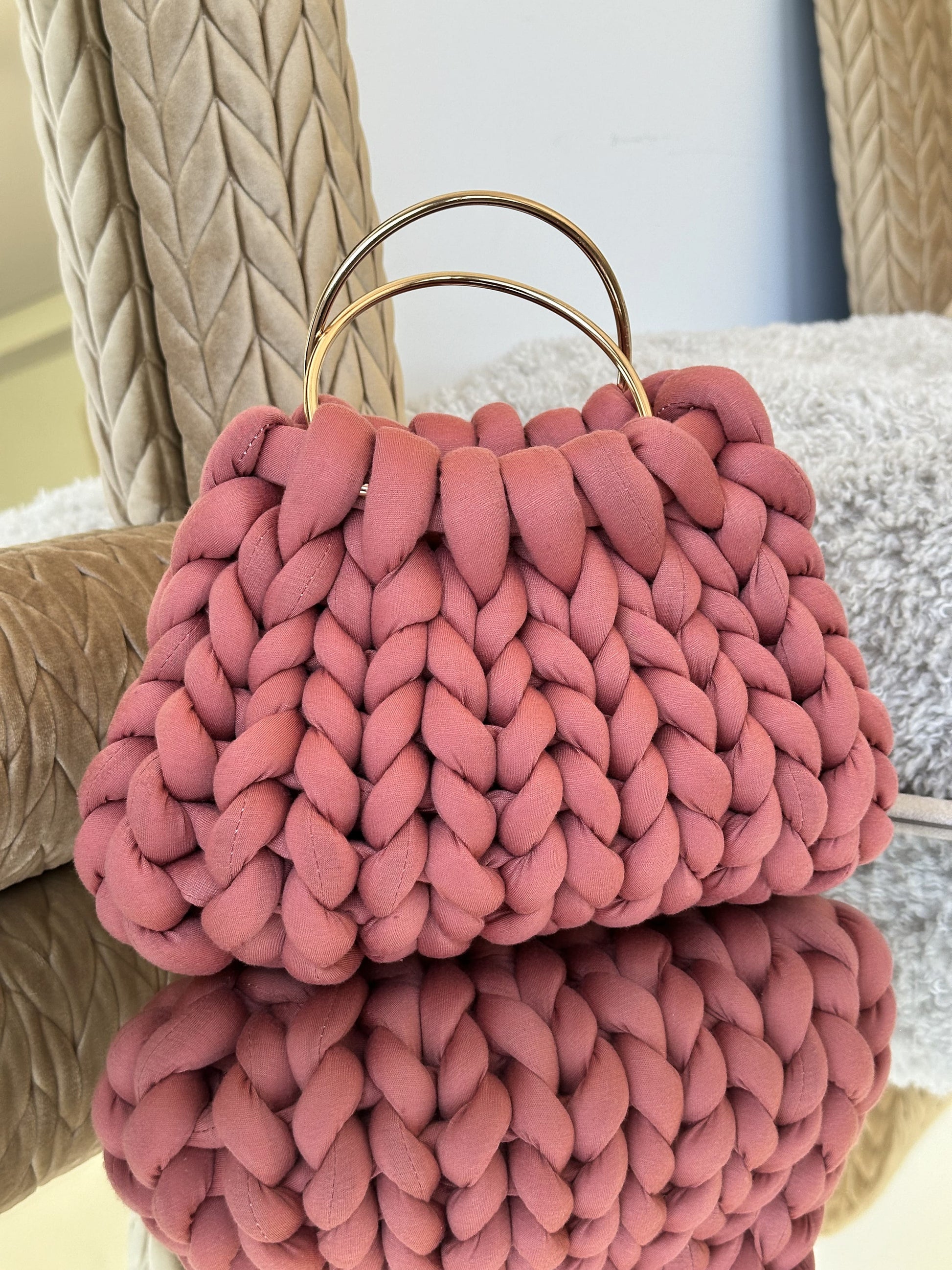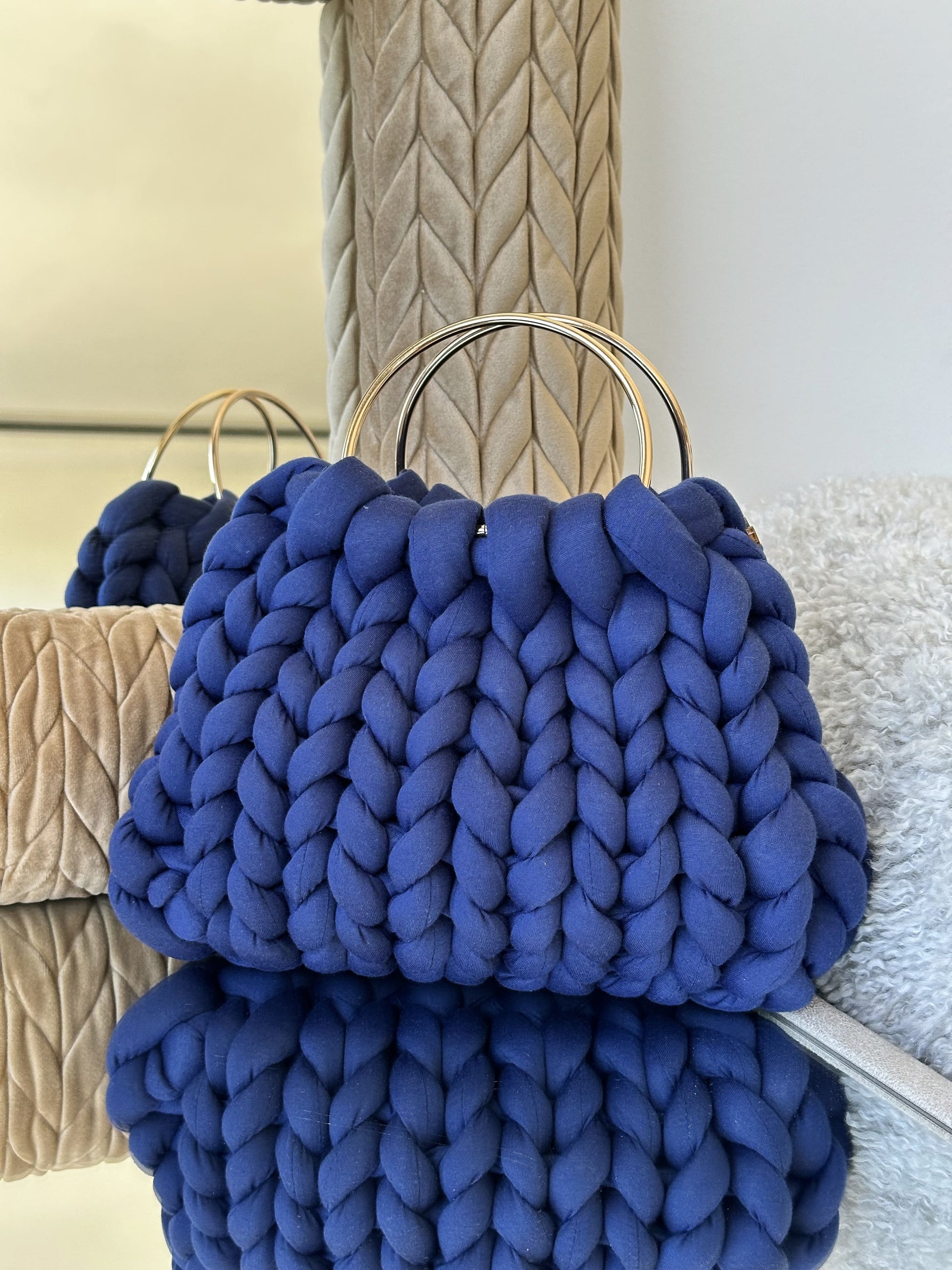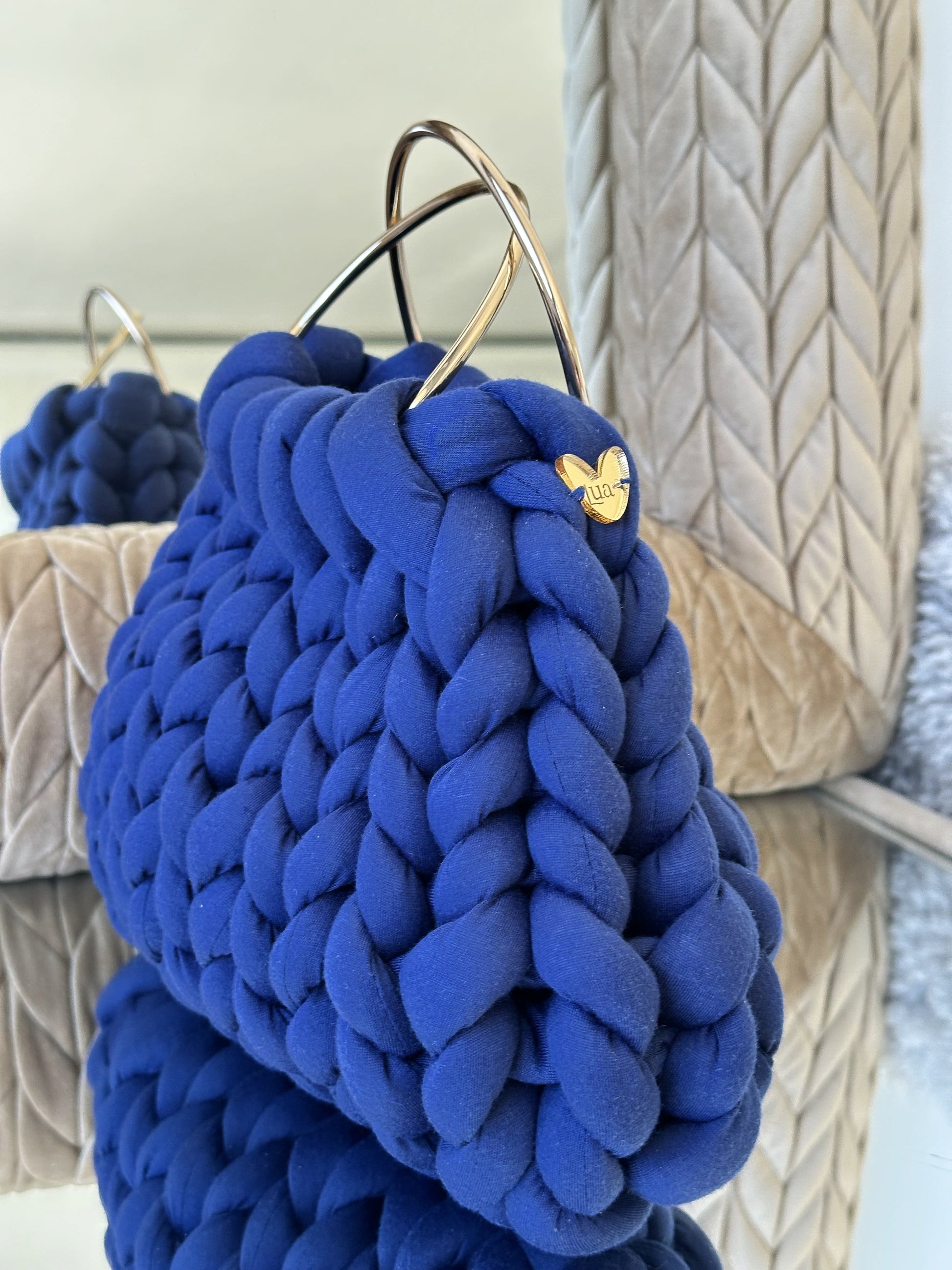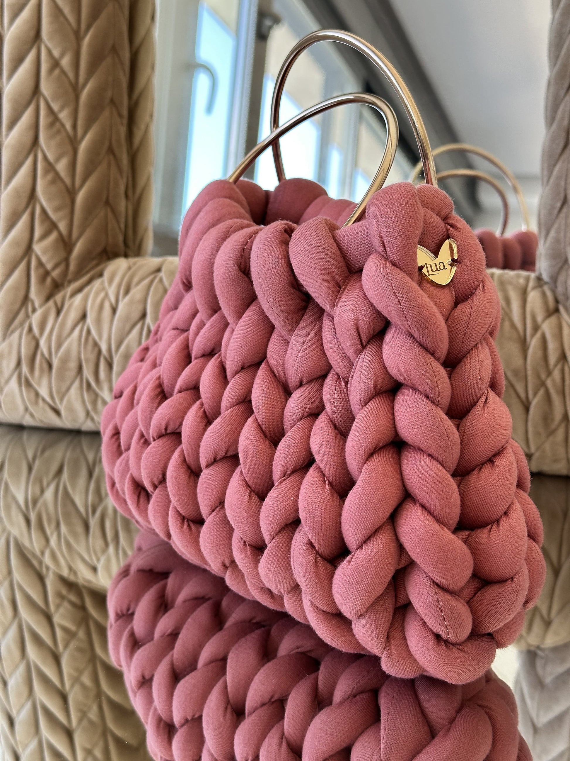 Cada Bombonera Lua está tejida a mano con hilos gruesos de alta calidad, creando un tejido mullido con mucho cuerpo que mantiene su forma sin perder ligereza.
