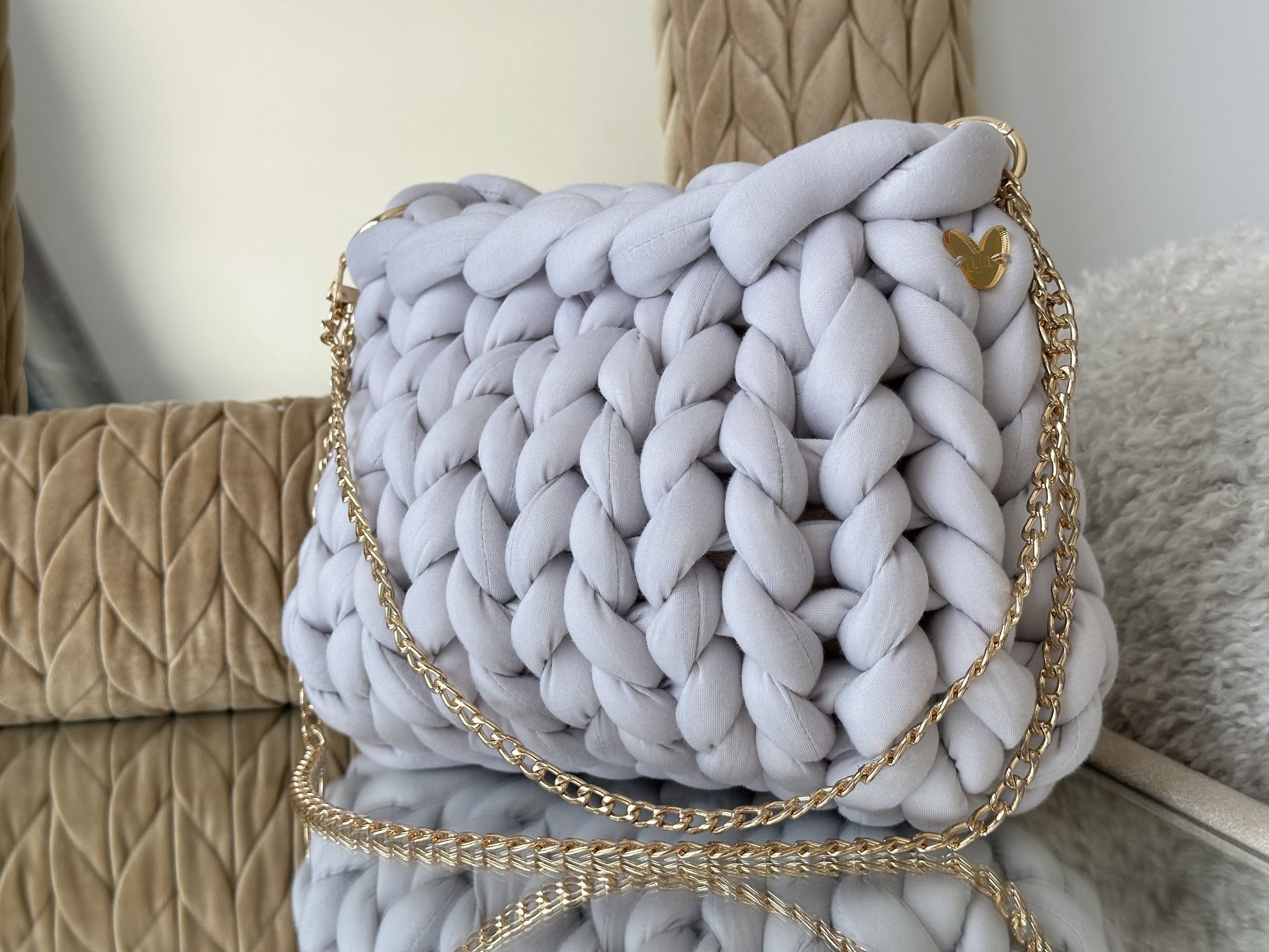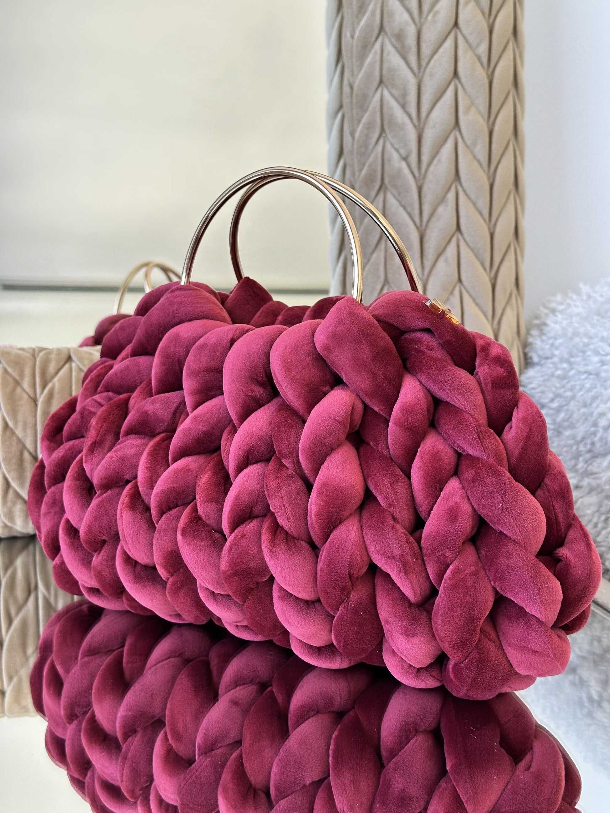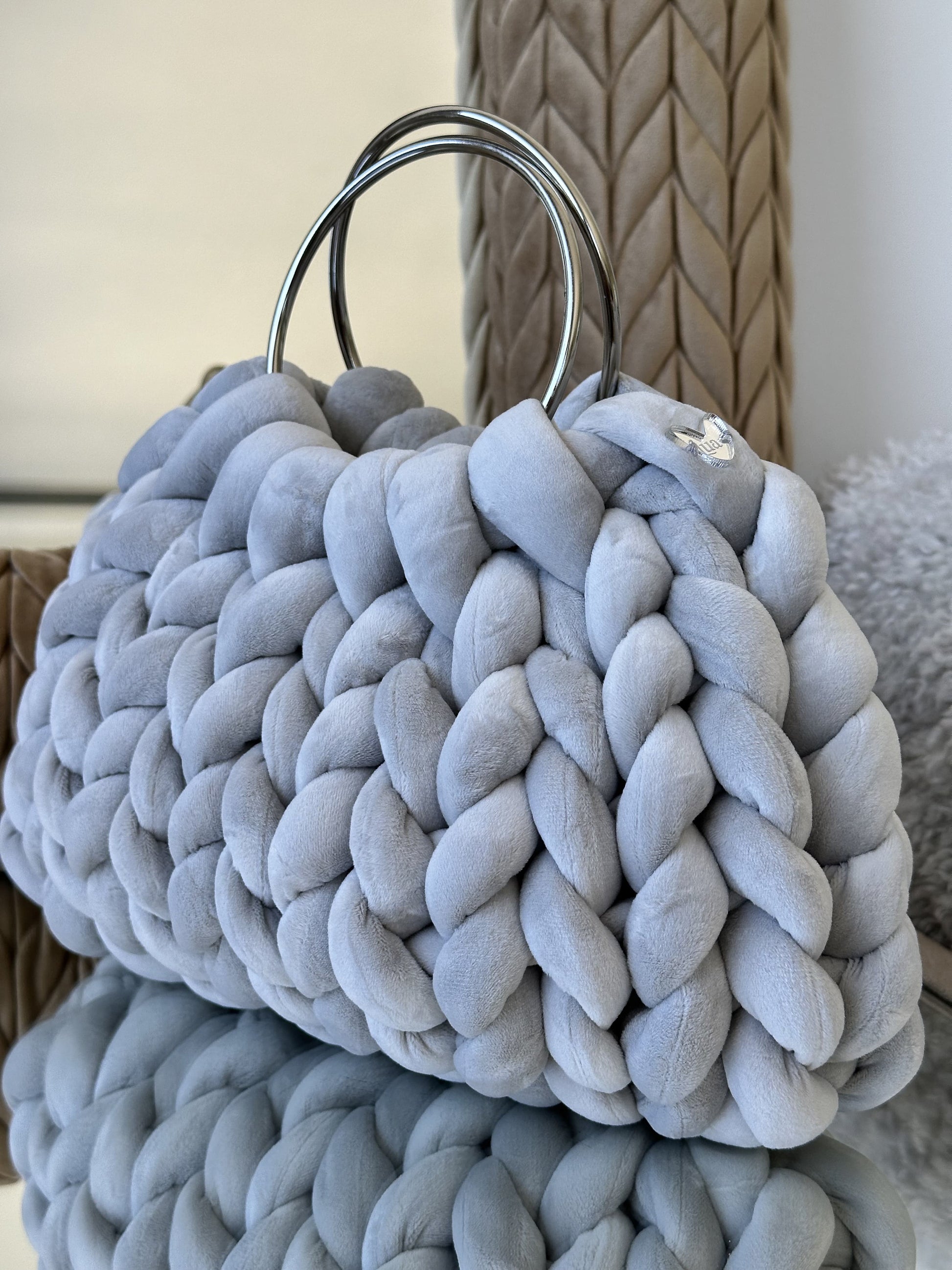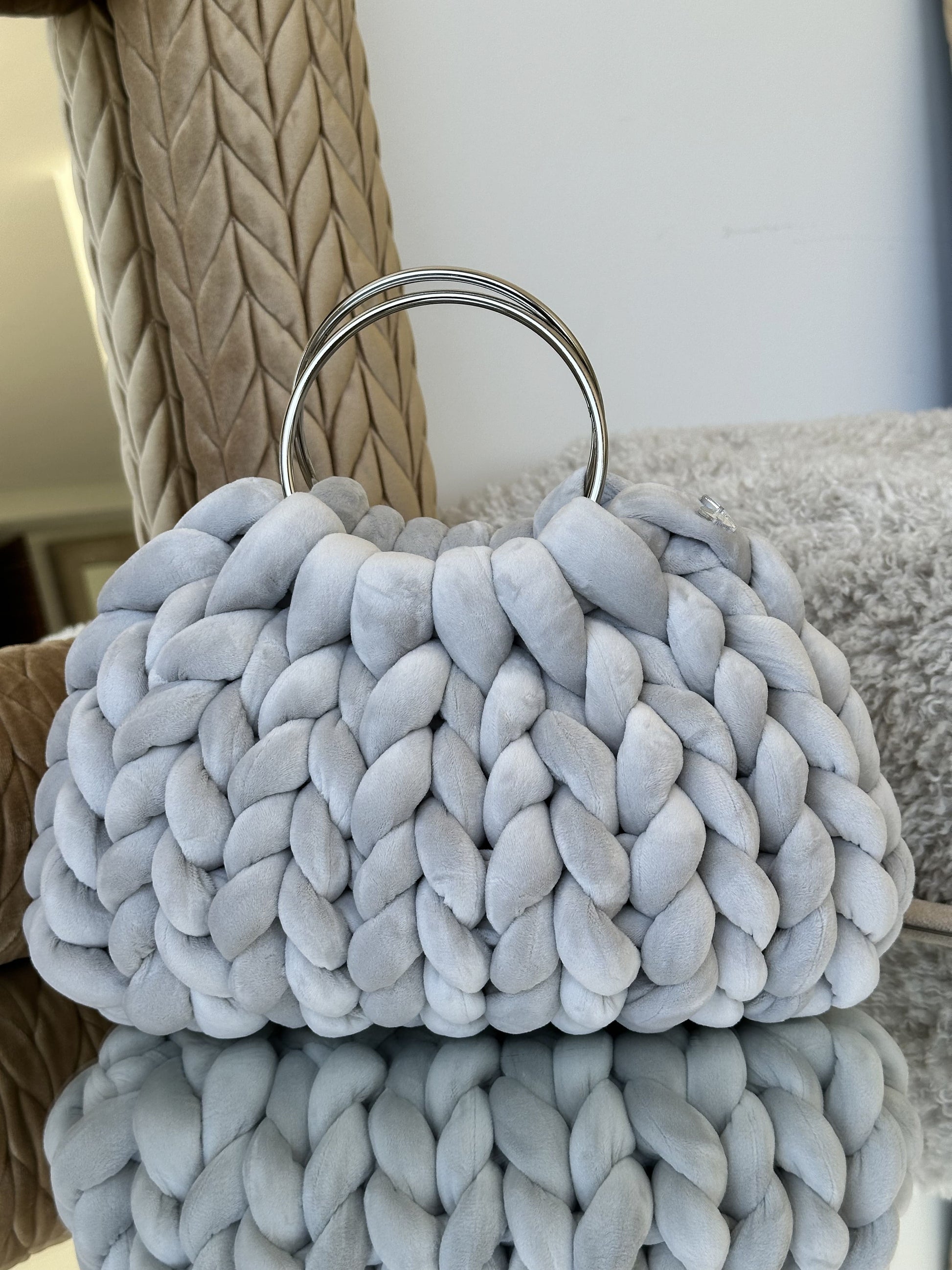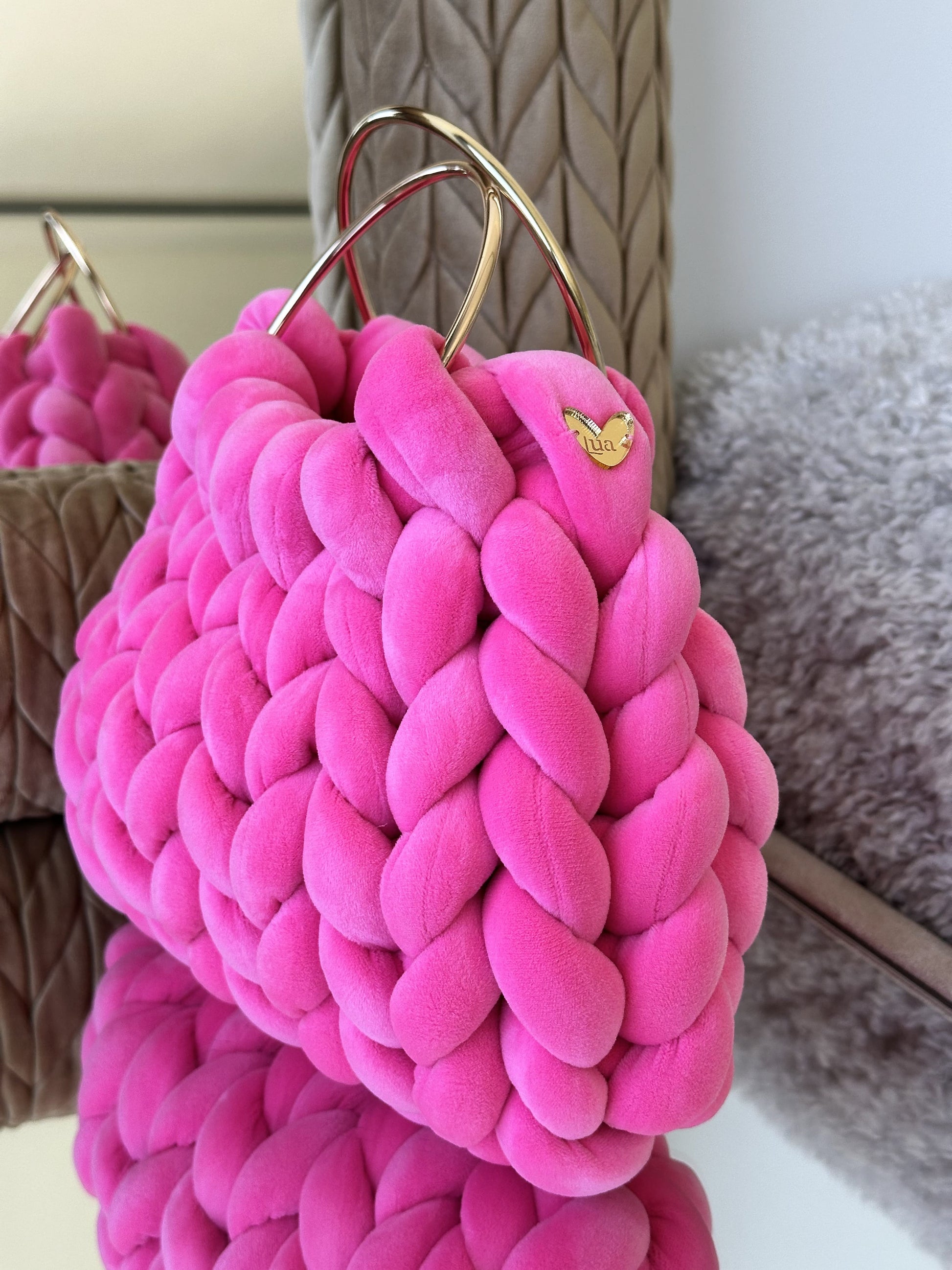 Cada Bombonera Lua está tejida a mano con hilos gruesos de alta calidad, creando un tejido mullido con mucho cuerpo que mantiene su forma sin perder ligereza.