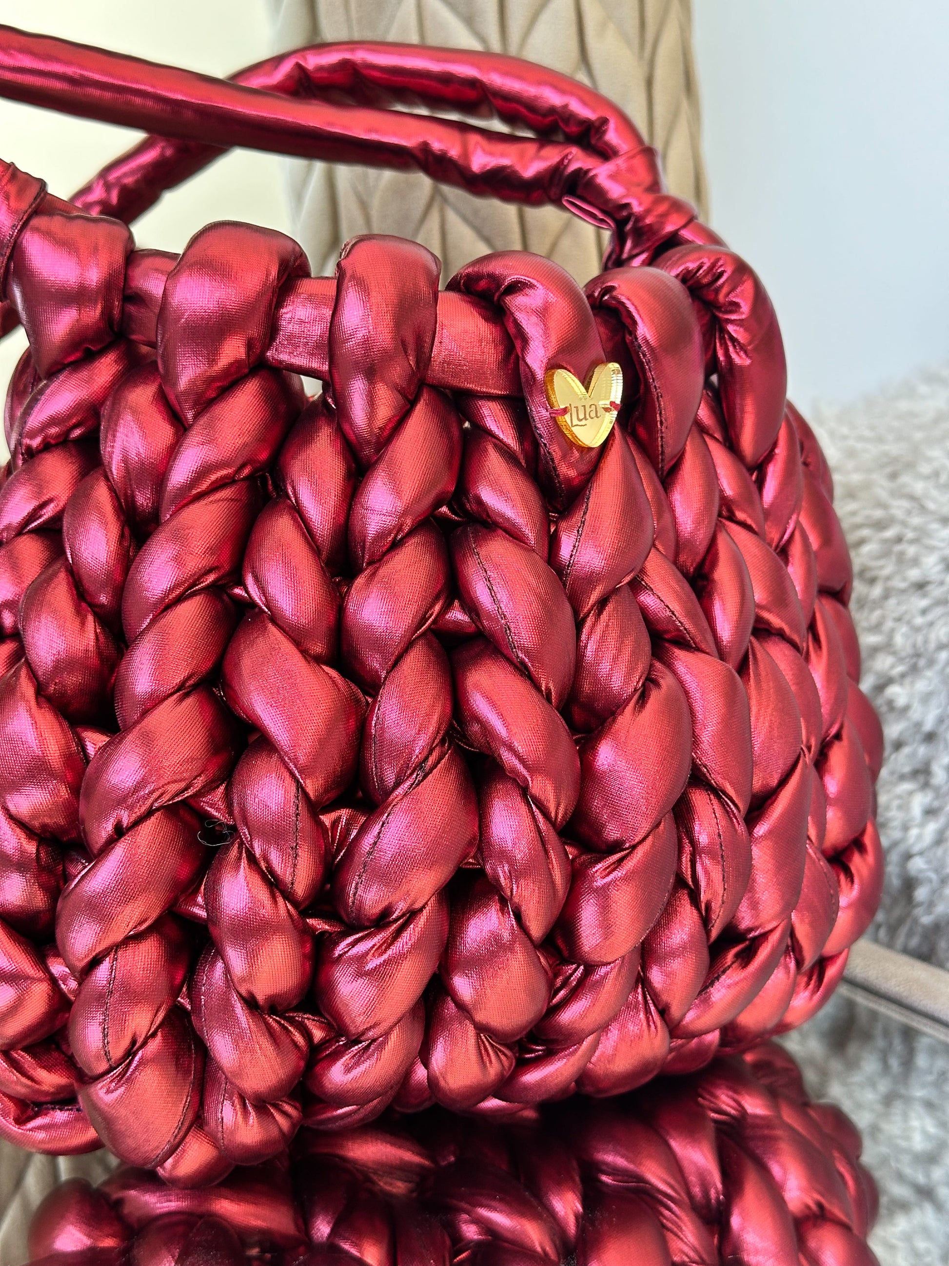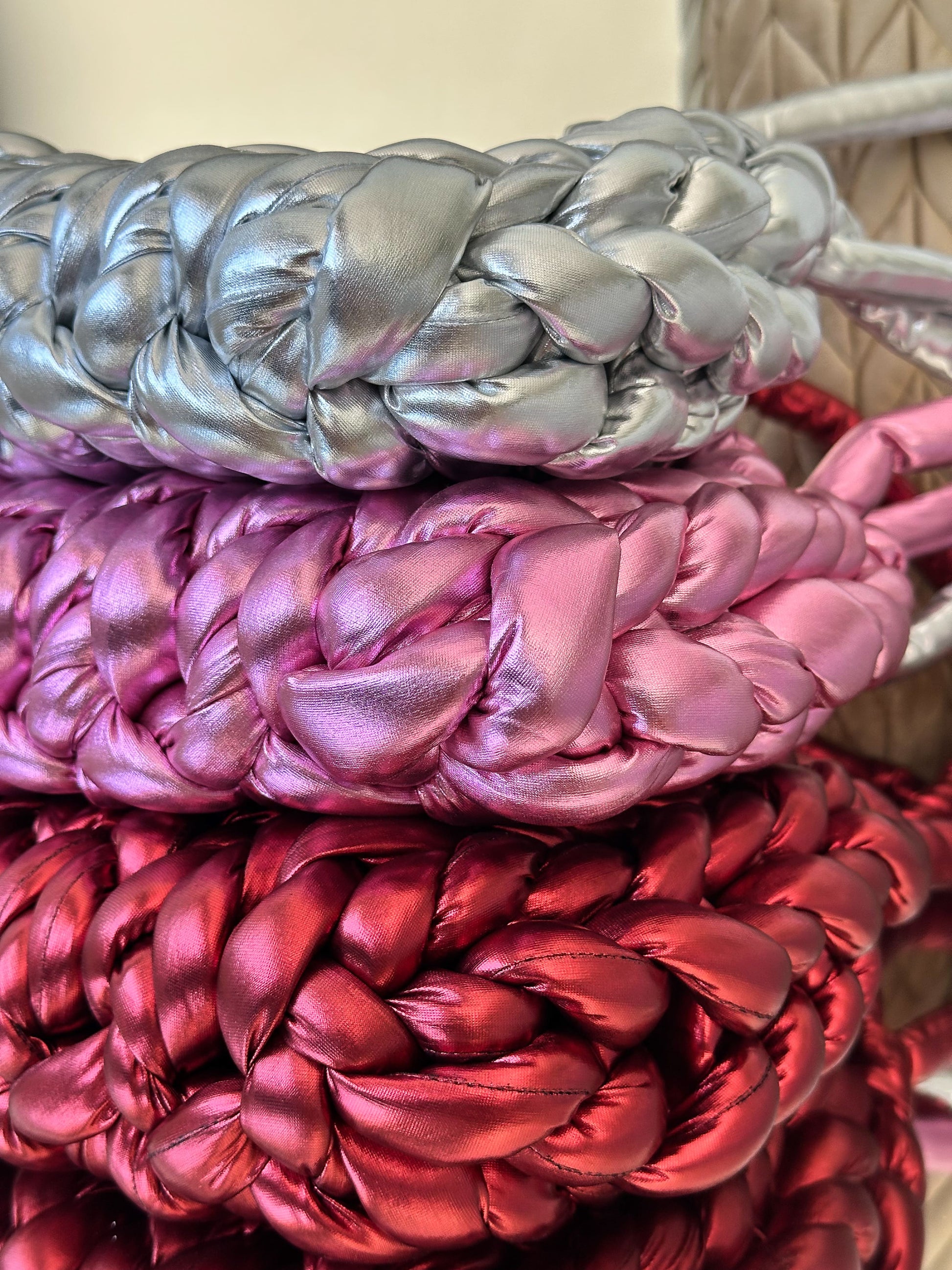 Cada Bombonera Lua está tejida a mano con hilos gruesos de alta calidad, creando un tejido mullido con mucho cuerpo que mantiene su forma sin perder ligereza.