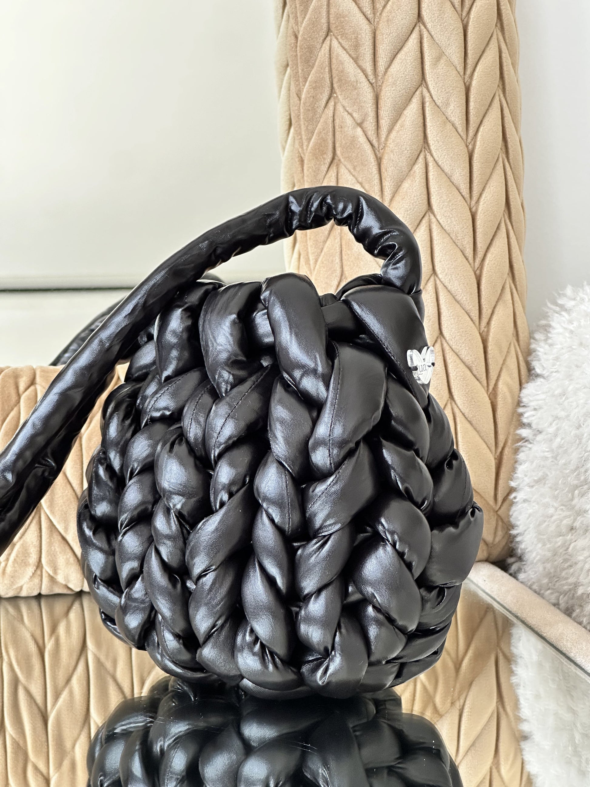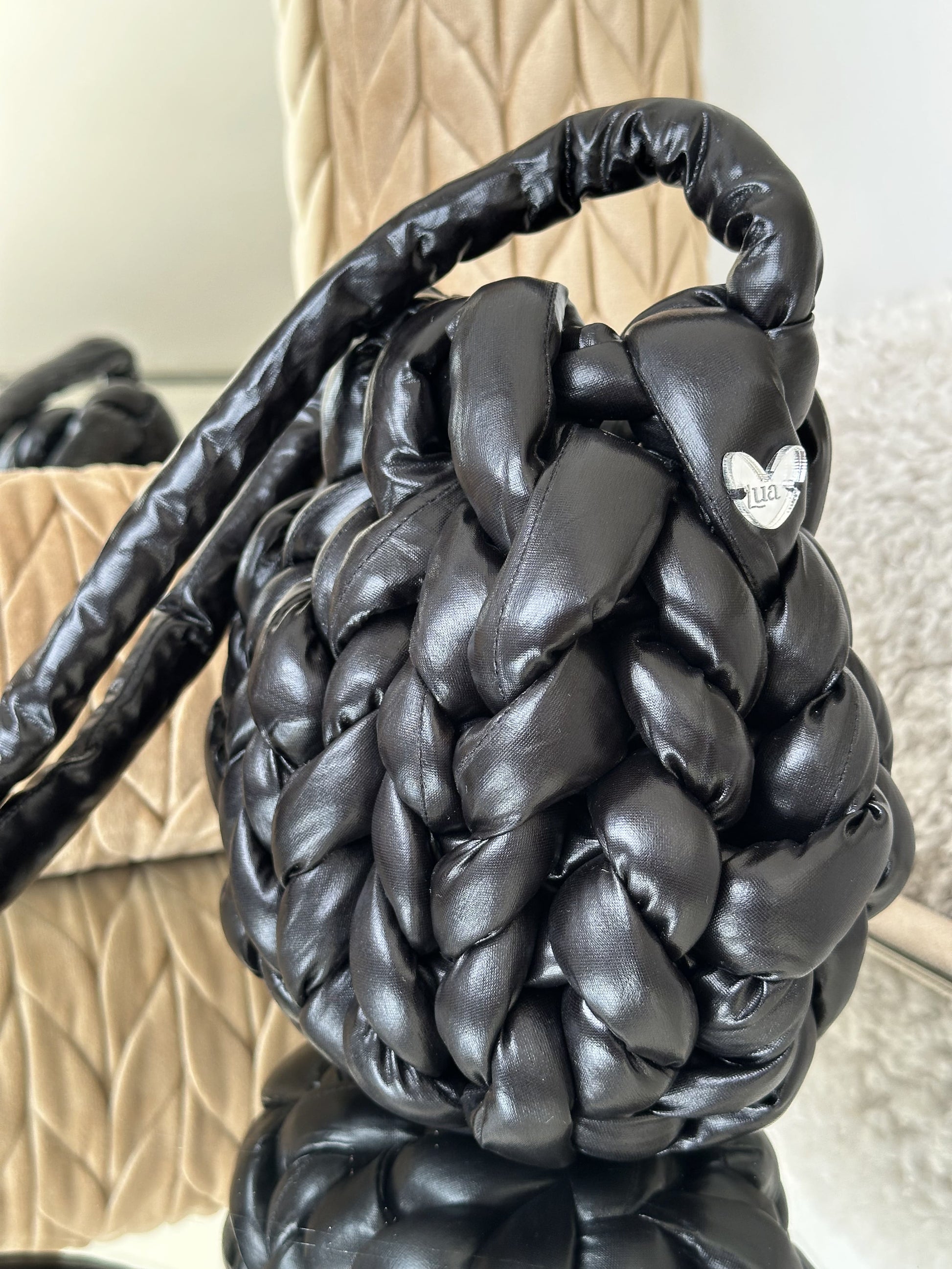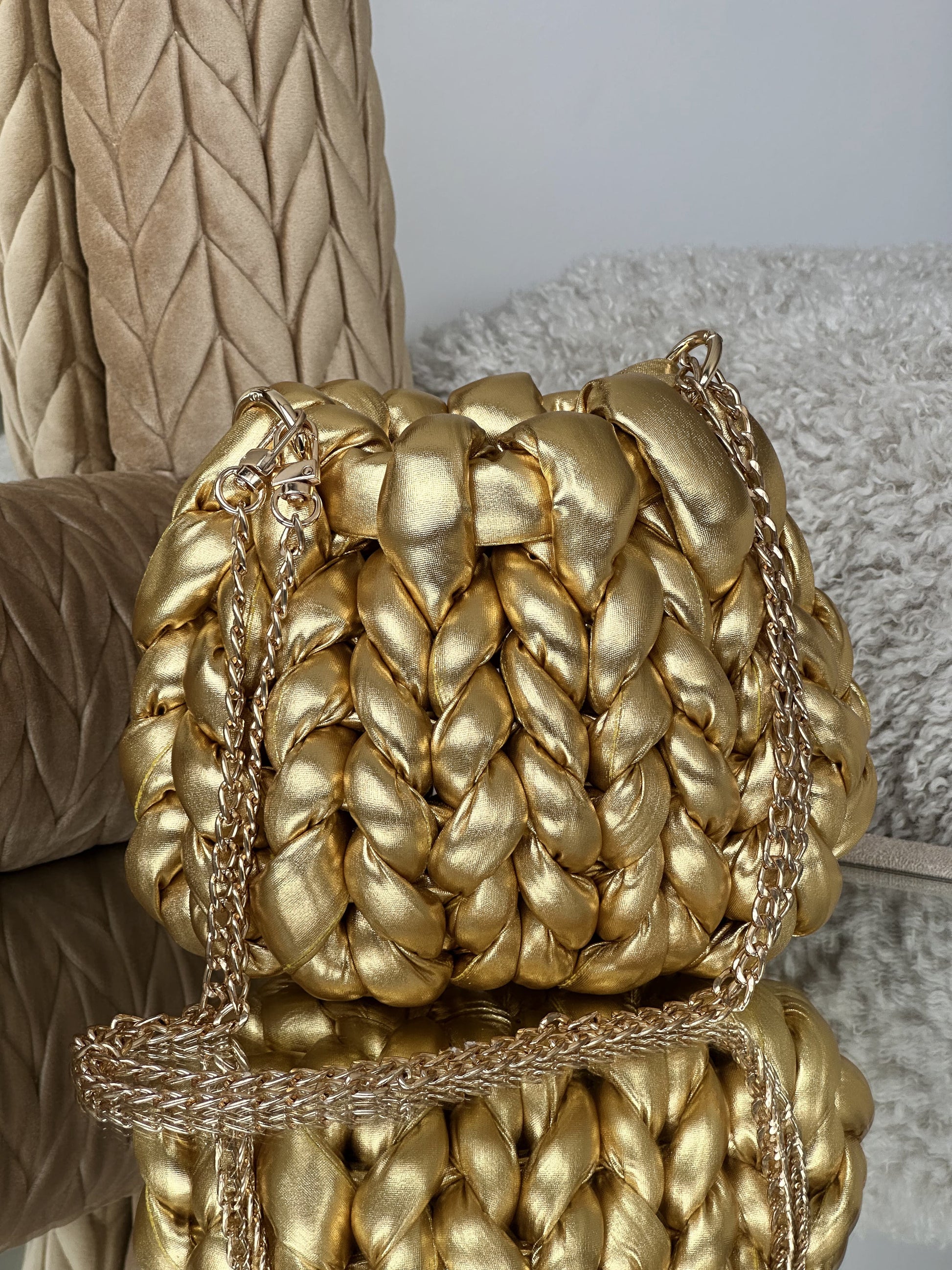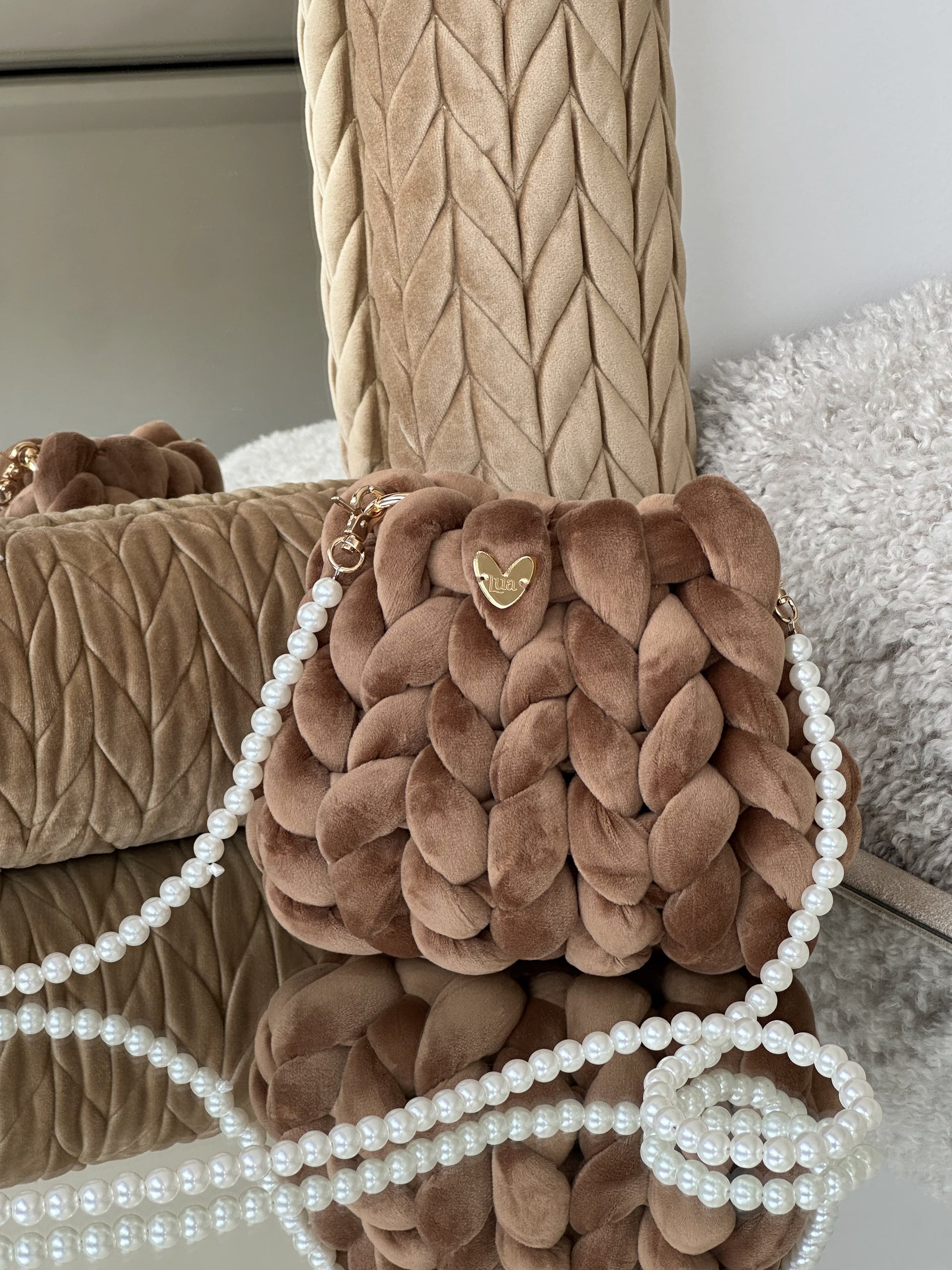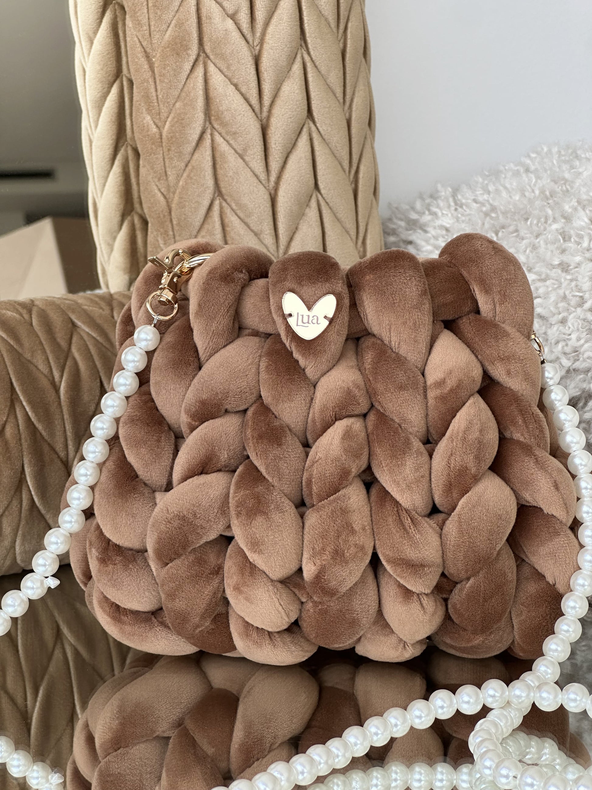 Cada Bombonera Lua está tejida a mano con hilos gruesos de alta calidad, creando un tejido mullido con mucho cuerpo que mantiene su forma sin perder ligereza.