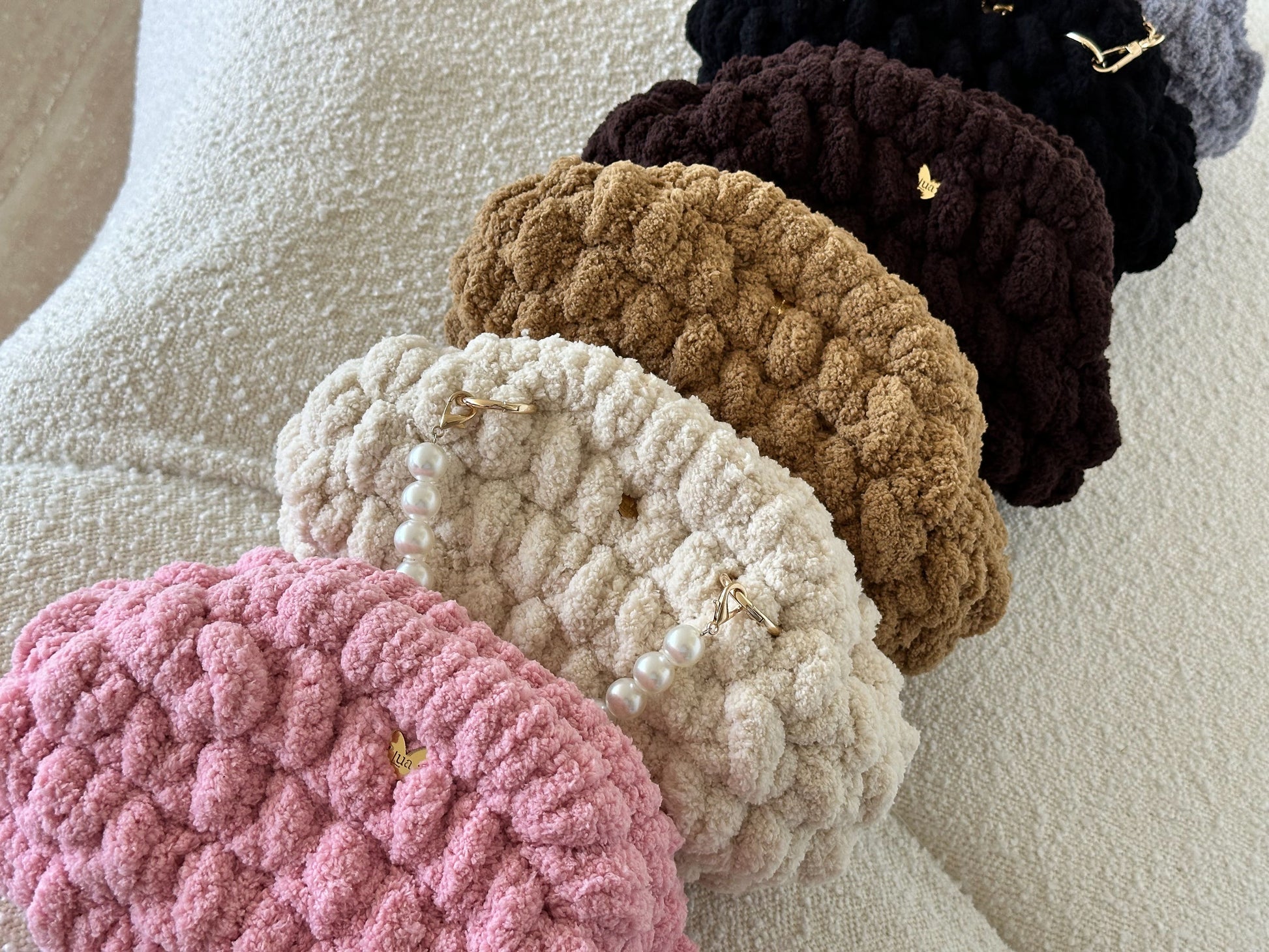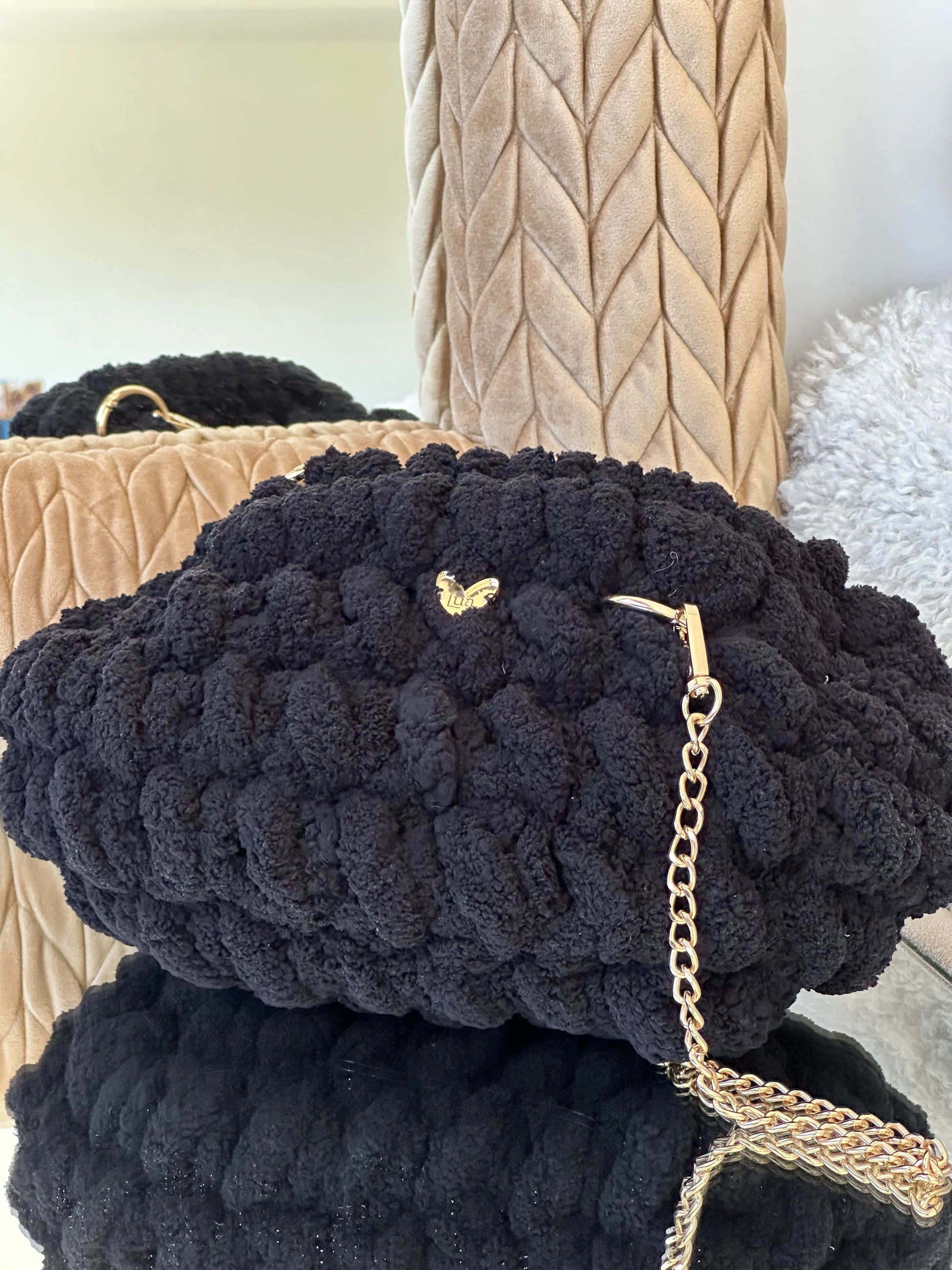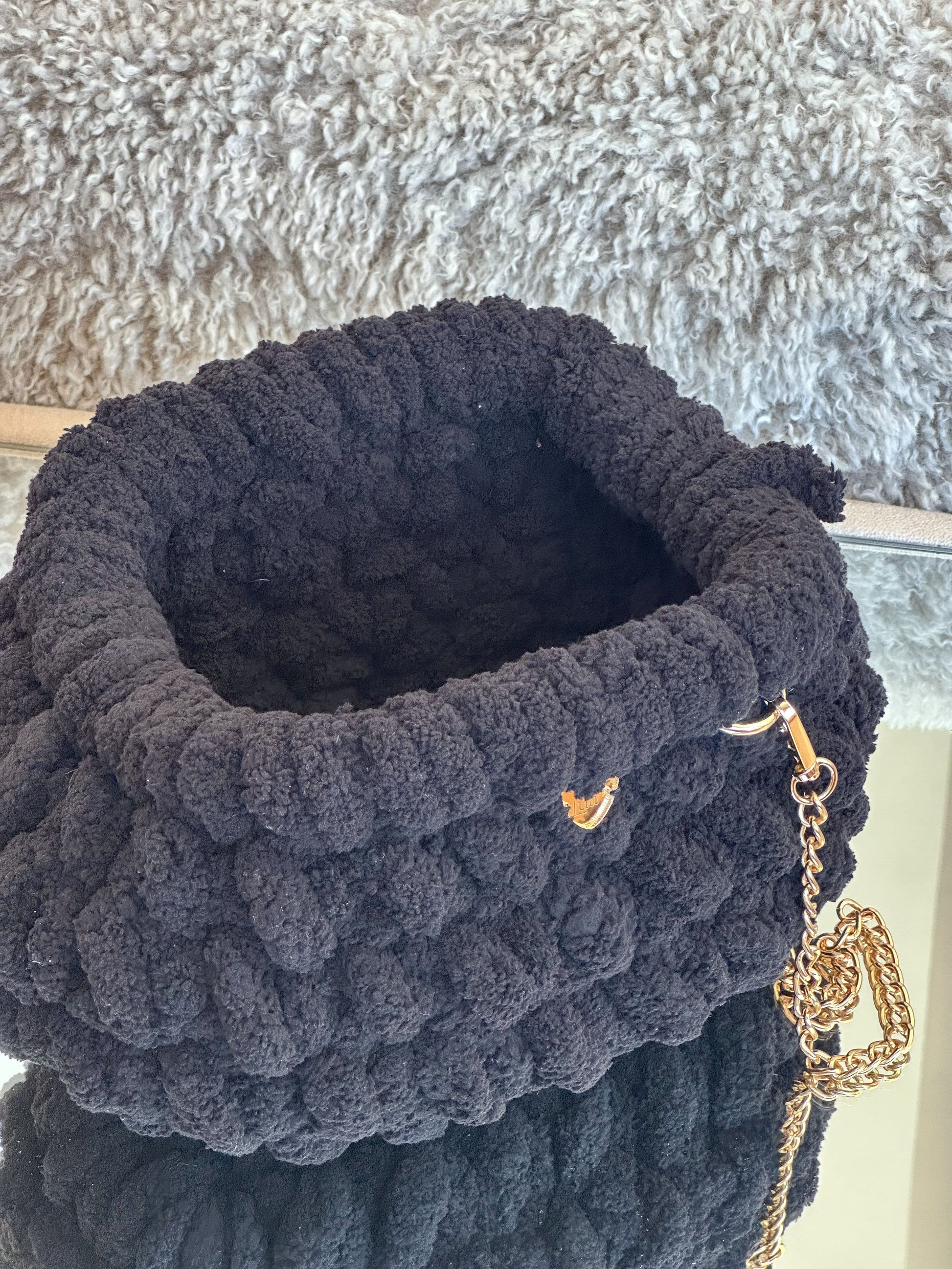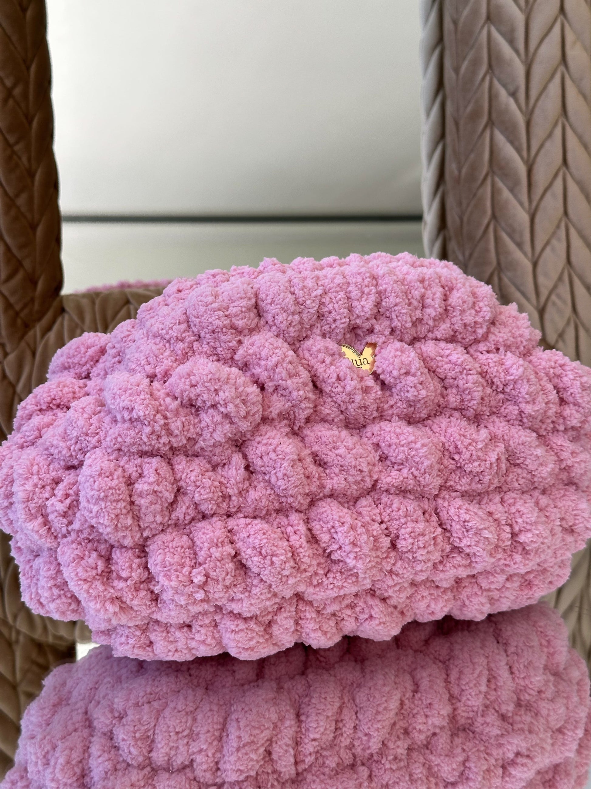 El Clutch Bombón está tejido a mano con hilo de chenille de grosor XL, creando un efecto mullido y brillante que recuerda a un auténtico bombón.