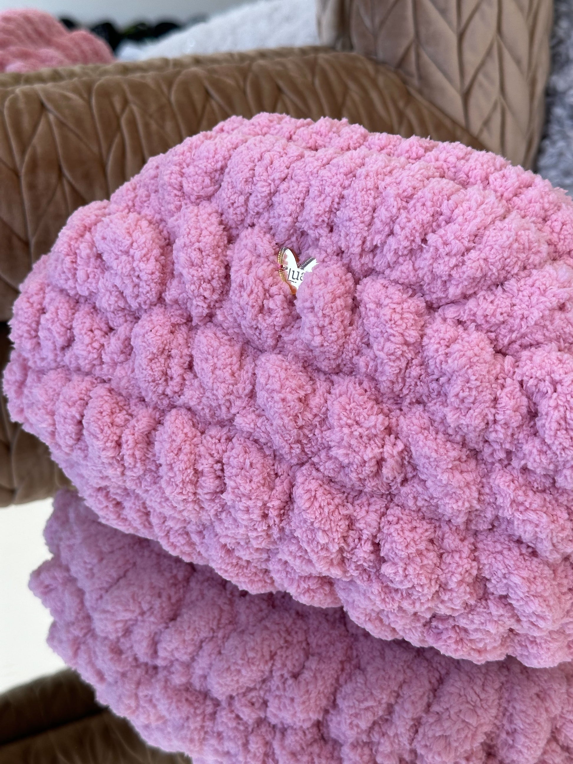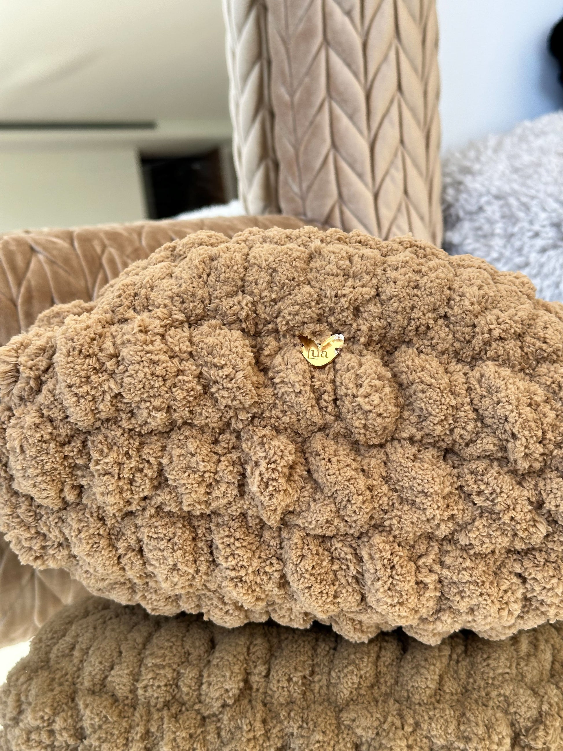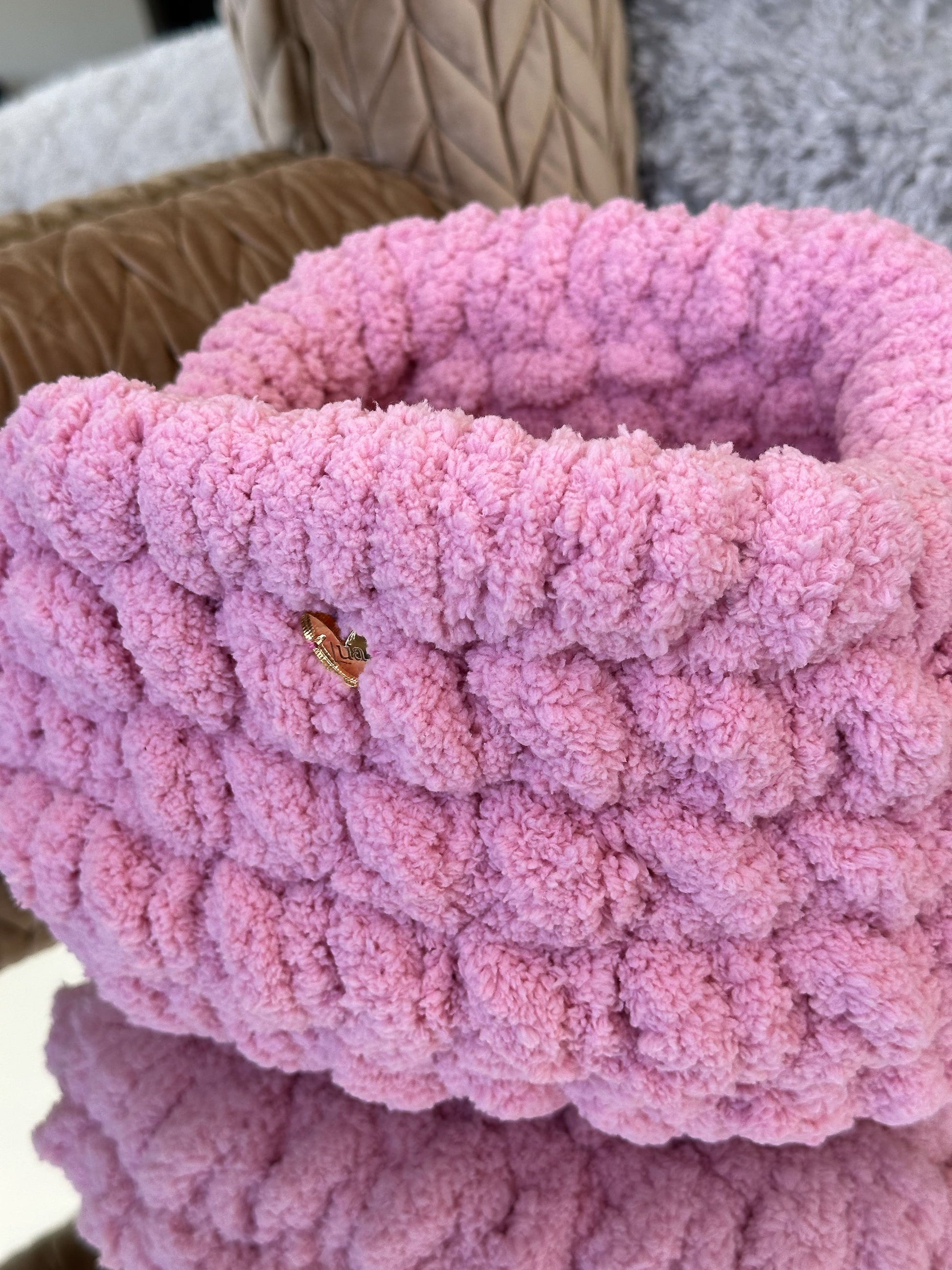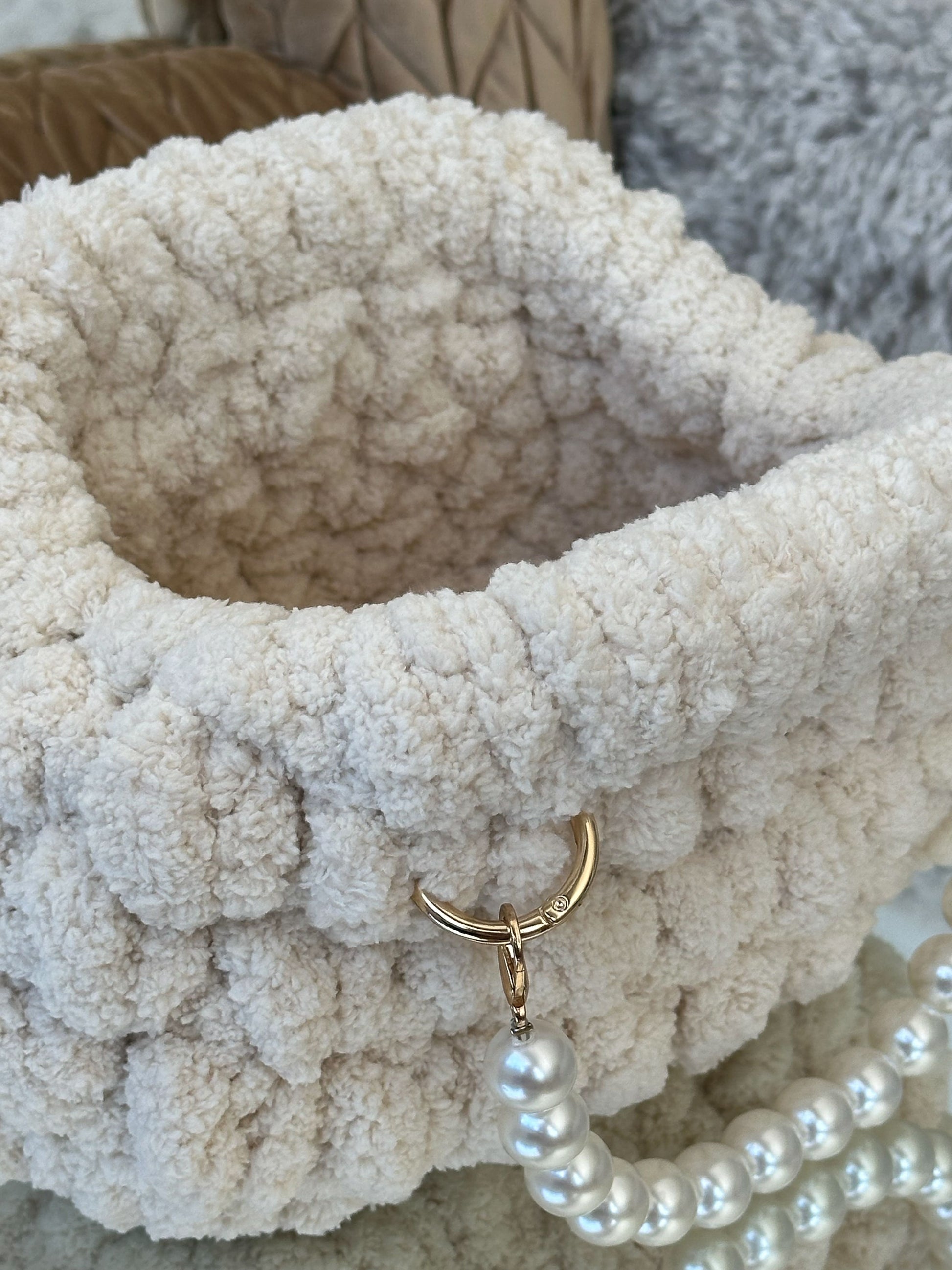 El Clutch Bombón está tejido a mano con hilo de chenille de grosor XL, creando un efecto mullido y brillante que recuerda a un auténtico bombón.