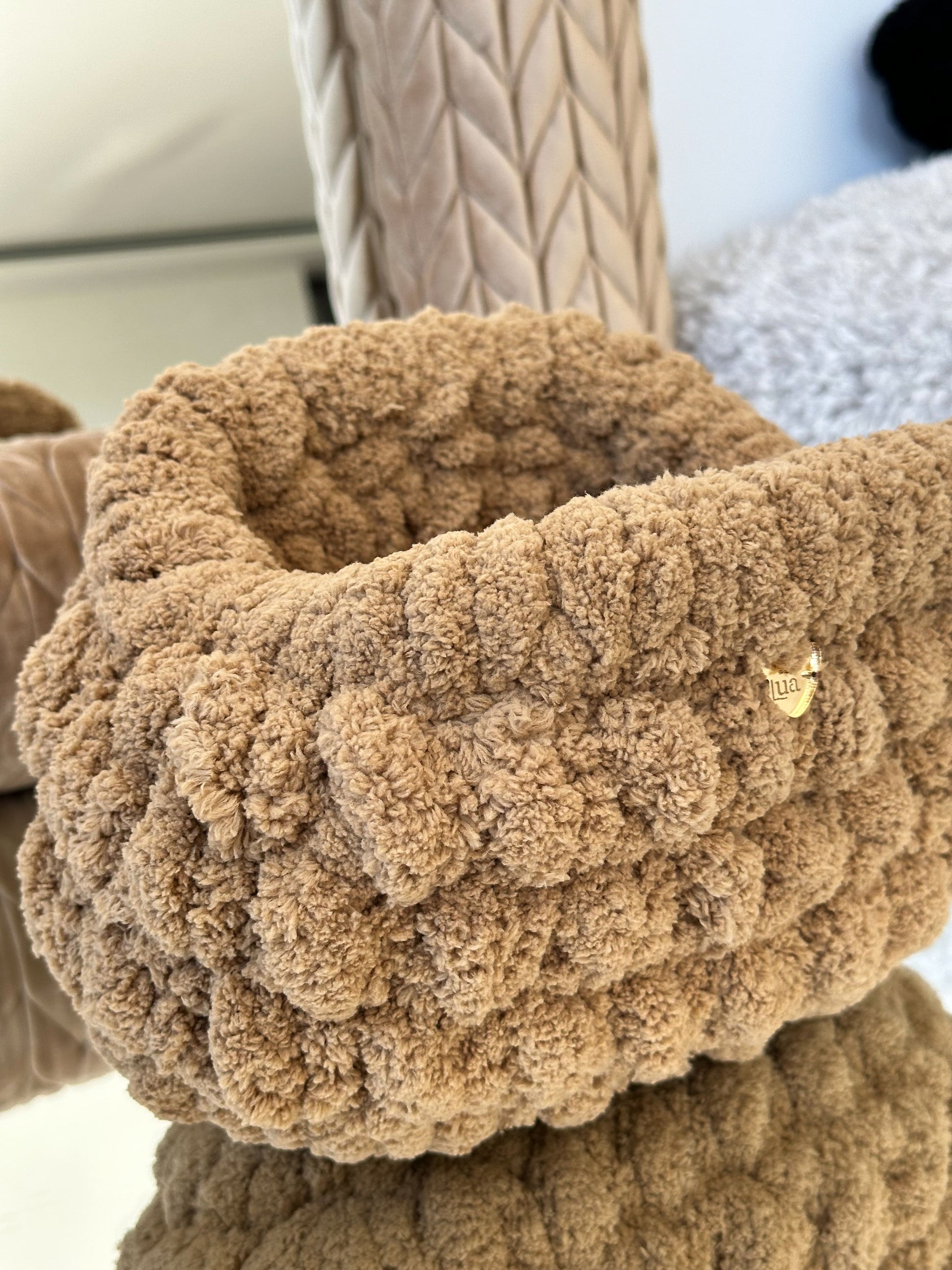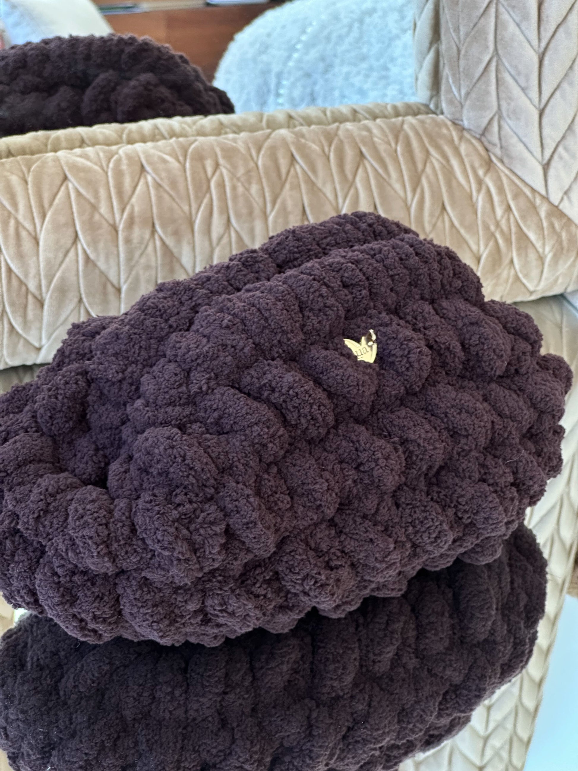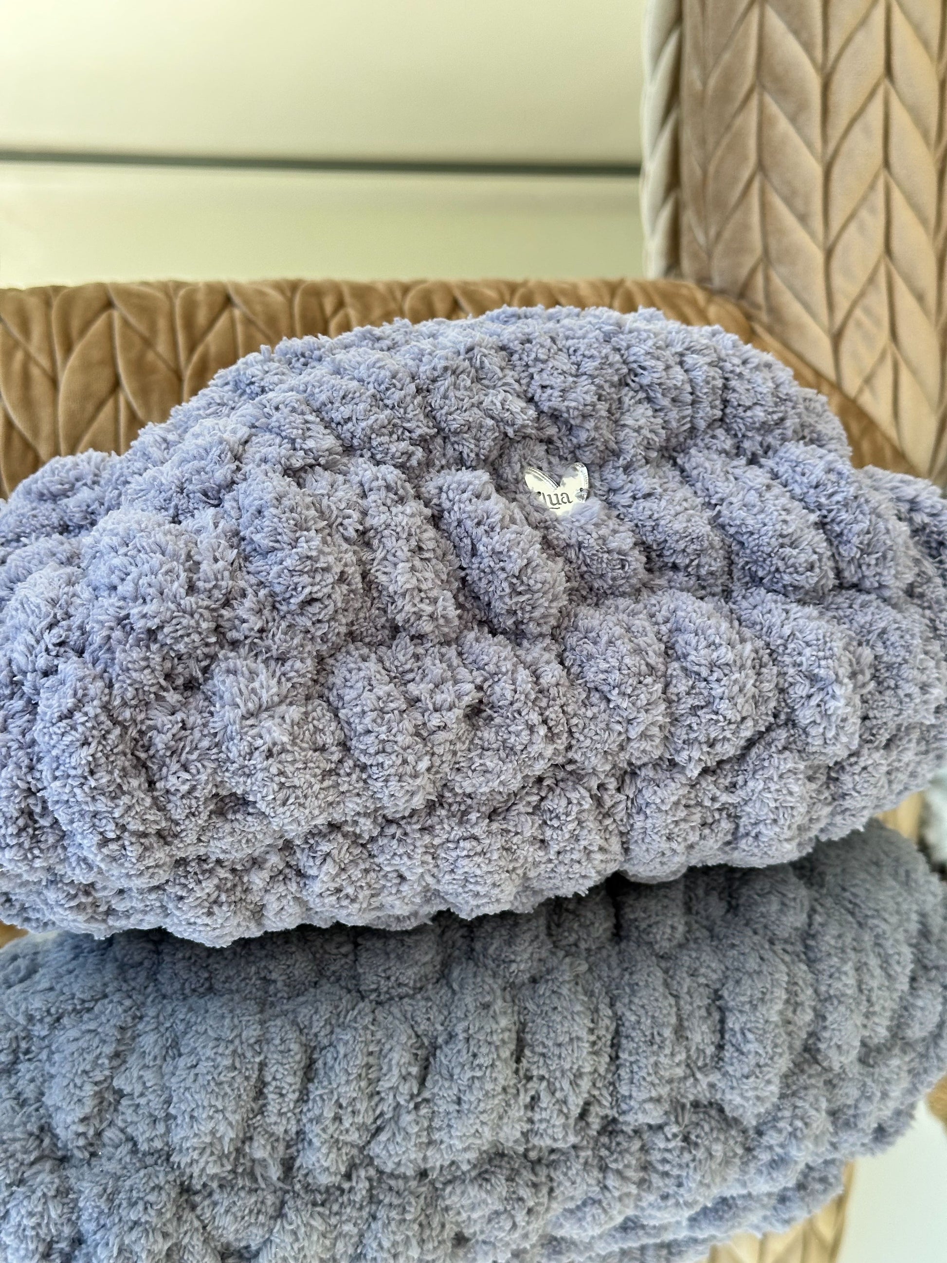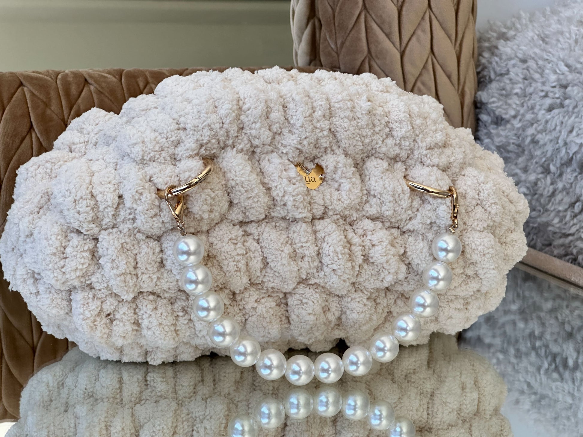 El Clutch Bombón está tejido a mano con hilo de chenille de grosor XL, creando un efecto mullido y brillante que recuerda a un auténtico bombón.