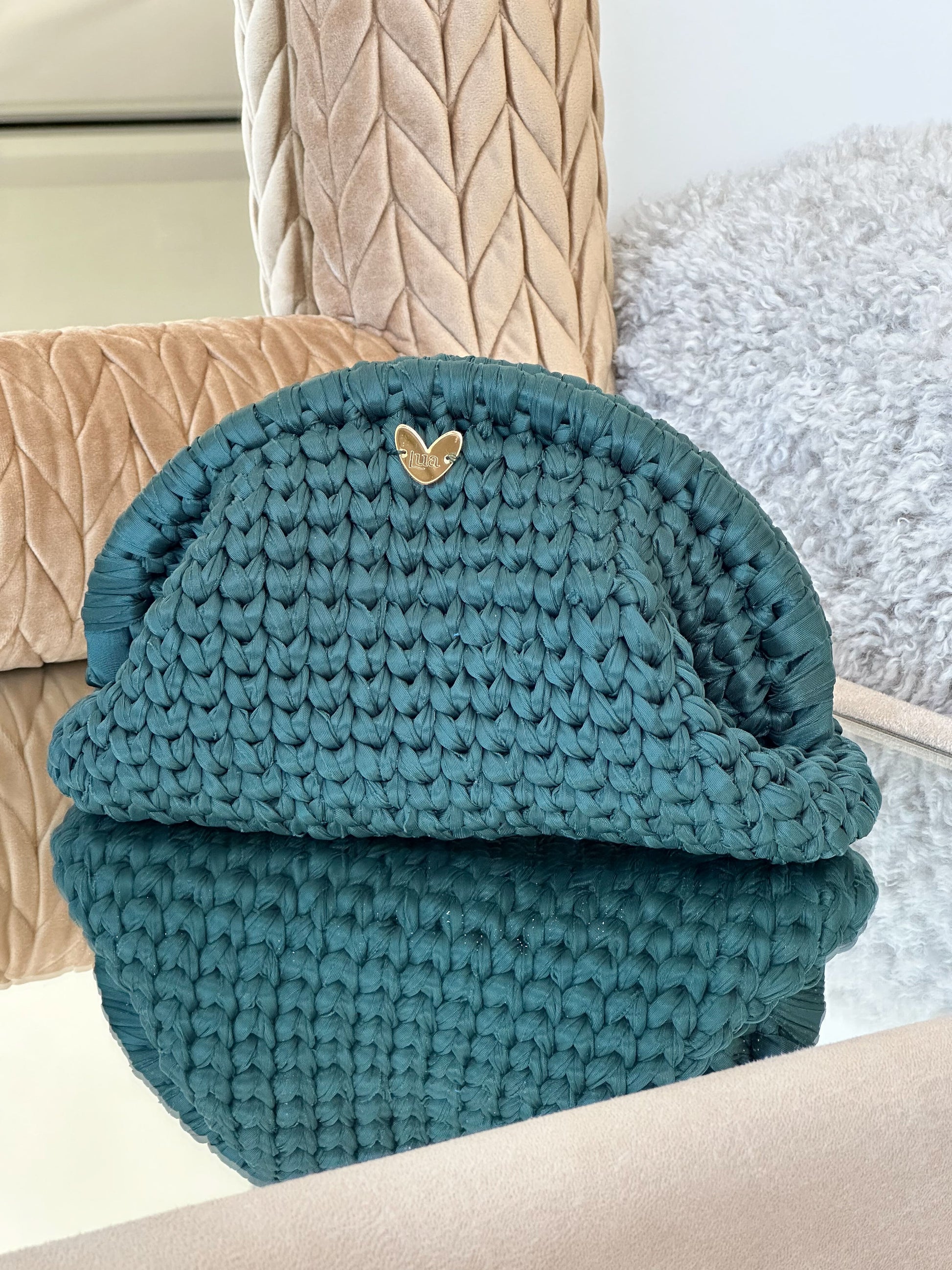 Este bolso está tejido a mano con trapillo ligero, que aporta un brillo satinado y una caída elegante, creando un efecto sofisticado que resalta su color verde profundo.